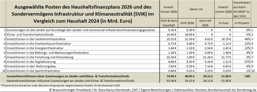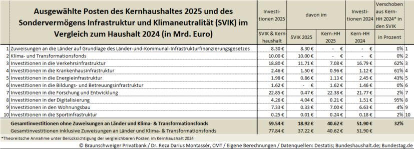 Bei der Analyse unserer Aufstellung fällt sofort auf, dass viele Posten aus dem Haushalt 2024 direkt in den SVIK 2025 oder SVIK 2026 verschoben wurden. Hier werden also keine neuen Investitionen finanziert, sondern nur Posten im Kernhaushalt übertragen, um andere Ausgaben dort platzieren zu können. Am krassesten wird dies in den Investitionen in die Infrastruktur ersichtlich. Hier sind im Kernhaushalt 2024 16,79 Mrd. Euro verausgabt worden. Im Kernhaushalt 2025 schrumpft dieser Betrag um 9,71 Mrd. Euro auf 7,08 Mrd. Euro. Im SVIK werden dafür 11,71 Mrd. Euro verbucht.