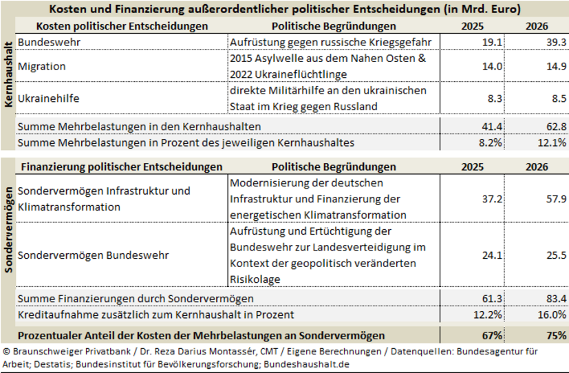 Wie der Tabelle 2 zu entnehmen ist, rechnen wir mit budgetären Mehrbelastungen aus außerordentlichen und weitreichenden politischen Entscheidungen vornehmlich der Jahre 2015 bis 2022 von 41,4 Mrd. Euro für das Jahr 2025 und von 62,8 Mrd. Euro für das Jahr 2026. Dass es hier nicht um Peanuts geht, zeigt der prozentuale Anteil der Kosten an den Kernhaushalten 2025 und 2026. Diese liegen im Schnitt immerhin bei 10 Prozent des Gesamthaushaltes. Doch was noch auffällt, ist, dass diese Kosten einen großen Block der beiden Sondervermögen „Infrastruktur und Klimatransformation“ sowie „Bundeswehr“ abdecken (durchschnittlich 71 Prozent). Hier drängt sich der Verdacht auf, dass die Bundesregierung die beiden Sondervermögen nutzt, um die hohen, durch frühere politische Entscheidungen verursachten Kosten buchhalterisch geschickt zu verpacken und mit den populären Schlagworten „Infrastruktur“ und „Klima“ wählerfreundlich zu refinanzieren.