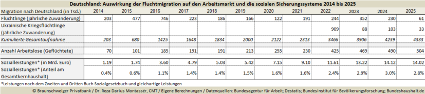 Die Schwäche, welche der Arbeitsmarkt signalisiert, ist also keineswegs als Schwäche der Wirtschaft oder Gesellschaft anzusehen, sondern Ausdruck dessen, dass die Integration der vielen Millionen Fluchtmigranten in den Arbeitsmarkt nicht hinreichend gelungen ist. Aus dieser Sicht muss klar festgehalten werden, dass der „Wir schaffen das“-Optimismus der damaligen Bundeskanzlerin leider nur sehr bedingt Realität geworden ist. Doch der Preis, den Deutschland für die Fehlentscheidung der „Willkommenskultur“ bezahlt, ist und bleibt hoch. Wie die Tab. 1 zeigt, sind unseren Berechnungen nach Sozialleistungen an Fluchtmigranten von 1,19 Mrd. Euro im Jahr 2014 auf aktuell 14,02 Mrd. Euro angestiegen. Damit ist auch der Anteil der Sozialleistungen für Fluchtmigranten am Bundeshaushalt entsprechend von 0,4 Prozent auf respektable 2,8 Prozent angestiegen.
