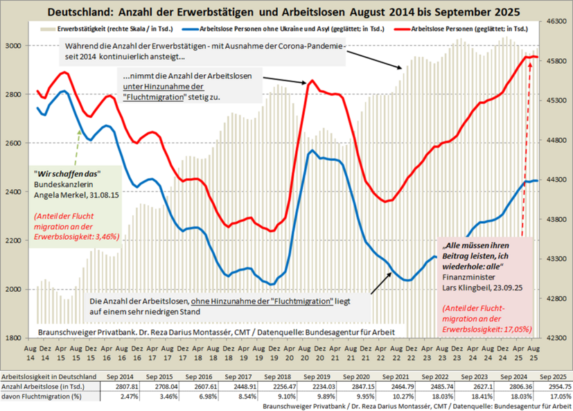 Aus der humanistischen Sicht muss klar postuliert werden, dass es sicherlich ein hehres Ziel der Bundeskanzlerin war, zu helfen und zu versuchen, das Leid der vielen Flüchtlinge vor Krieg und Terror zu mindern. Doch ihre Fehleinschätzung war wohl, dass Deutschland allein die finanzielle und integrative Last der Millionen von Flüchtlingen tragen können würde. Doch auch heute, zehn Jahre nach der ersten großen Flüchtlingswelle nach Deutschland, ist die Politik nicht ehrlich und gaukelt den Menschen Halbwahrheiten vor. Ein Beispiel hierfür sind die Arbeitsmarktzahlen in Deutschland. Als im vergangenen August die Arbeitslosenzahl in Deutschland erstmals seit Februar 2015 wieder über drei Millionen stieg, wurde das als sicheres Zeichen der schwachen Wirtschaft gedeutet. Bundeskanzler Merz kommentierte: