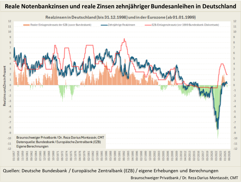Dennoch: Sollte sich die geoökonomische Lage verschlechtern, könnte die EZB aufgrund von Basiseffekten, welche die Inflation im Frühjahr 2026 zwischenzeitlich unter 2 Prozent drücken könnten, noch einmal an der Zinsschraube in Richtung 1,75 Prozent (Einlagenzinssatz) drehen. Weitere Zinssenkungen scheinen aktuell auch aufgrund der niedrigen Realzinsen von -0,1 Prozent beim Einlagenzinssatz weniger wahrscheinlich (vgl. Abb. 4). Denn von der EZB bewusst in Kauf genommene tiefere negative reale Notenbankzinsen wären aus unserer Sicht nur dann wahrscheinlich, wenn sich weltweite Krisen auftun, welche das Wirtschaftswachstum oder den Finanzmarkt in der Eurozone nachhaltig schwächen oder gar strukturell gefährden würden.