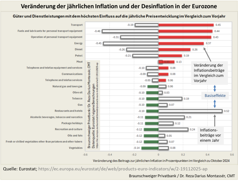 Wie ist zu erklären, dass die aktuell niedrigen Energiepreise einen inflationären Einfluss auf die Gesamtinflation ausüben? Die Frage lässt sich einfach beantworten: Es handelt sich hierbei um Basiseffekte. Wie anhand der Abbildung 3 zu erkennen ist, lieferten Transport- und Energiepreise im Oktober 2024 einen deutlich deflationären Beitrag zur Inflationsentwicklung. Dieser negative Beitrag hat sich aufgrund der Tatsache, dass die Energiepreise von Oktober 2024 bis Oktober 2025 nicht mehr so deutlich gefallen sind wie in der Zwölfmonatsperiode bis Oktober 2024, nun ins Umgekehrte gedreht. Ähnlich verhält es sich mit den zuvor angesprochenen Lebensmitteln, eben nur in der umgekehrten Logik. Wie die Abbildung 3 also insgesamt verdeutlicht, ist ein guter Teil der aktuell ausgewiesenen Jahresinflation ausschließlich auf Basiseffekte zurückzuführen, sodass sich negative und positive Beiträge einzelner Produkte und Dienstleistungen im Laufe des Jahres aufgehoben haben. Allerdings ist eine kleine inflationäre Verschiebung zu erkennen. So haben sich Plus und Minus bei den betrachteten Gütern und Dienstleistungen nicht gänzlich aufgehoben, so dass der Gesamtbeitrag im Oktober 2025 um – allerdings vernachlässigbare – 0,08 Prozentpunkte höher ist als im Oktober 2024. Damit lässt sich mit positivem Grundton feststellen, dass aktuell vom Gros der Waren und Dienstleistungen kein neuer und zusätzlicher Inflationsdruck zu messen ist. Somit wird die Inflation zurzeit lediglich durch Basiseffekte oder Favoritenwechsel geprägt.