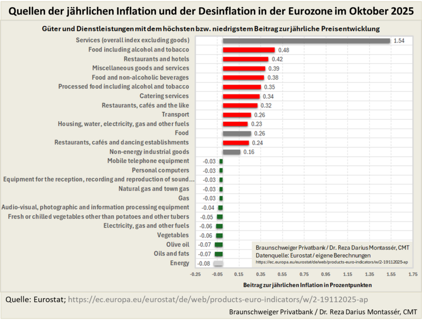 Dies erklärt auch, weshalb sich die Gesamtinflation schon seit Monaten kaum vom Fleck rührt. Dennoch besteht hintergründig hoher Inflationsdruck über den Dienstleistungssektor. Dieser sorgt aktuell mit einem Beitrag von 1,54 Prozent dafür, dass die Gesamtinflation sich stabil nahe der Zwei-Prozent-Zielmarke der EZB bei 2,1 Prozent bewegt.
