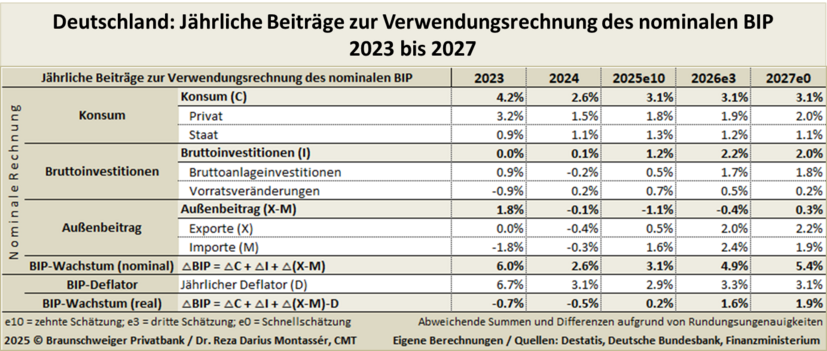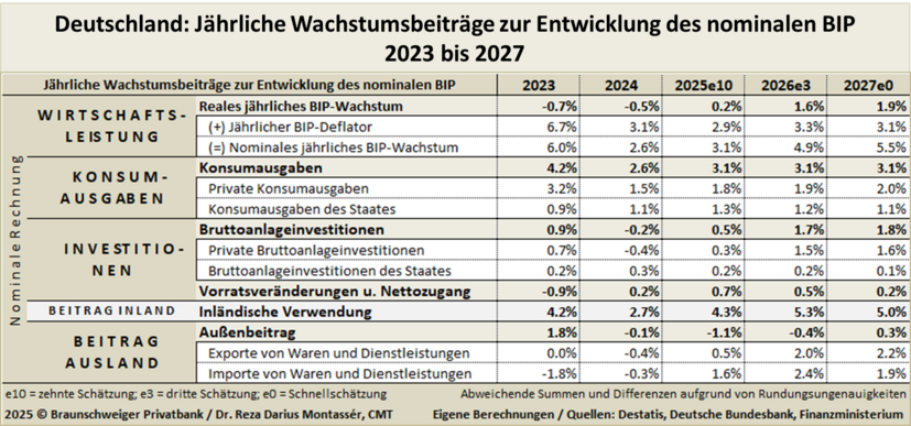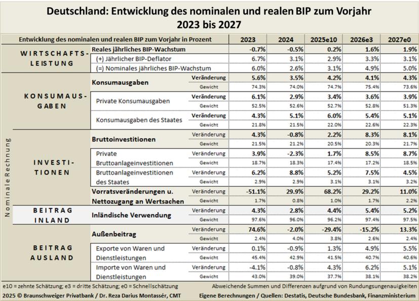 Doch kommen wir zunächst zum Hier und Jetzt: Wir hatten am 3. März 2025 für das Gesamtjahr 2025 ein BIP-Wachstum von 0,3 Prozent prognostiziert7 und waren damit etwas optimistischer als die führenden deutschen Wirtschaftsforschungsinstitute, die etwas später, am 1. April 2025, in ihrer Gemeinschaftsprognose ein Wachstum von 0,1 Prozent voraussagten.8 Jetzt, Mitte Dezember, sieht es so aus, als ob sich das deutsche BIP-Wachstum im Bereich 0,2 Prozent bis 0,3 Prozent für das Jahr 2025 einpendeln wird. Ursächlich für dieses schwache Wachstum sind zum einen der gedämpfte private Konsum und zum anderen aber auch die maue Entwicklung der privaten Bruttoanlageinvestitionen sowie der durch den amerikanischen Zollkrieg geschwächte Außenhandel.