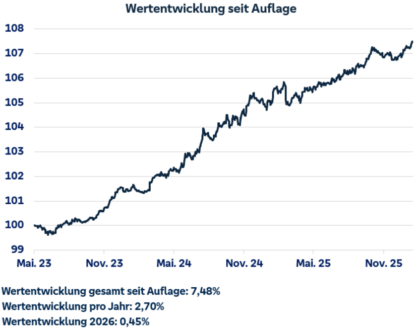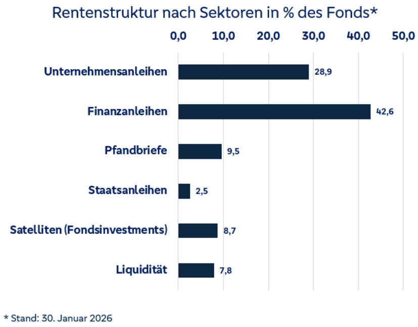 Wir haben im Monatsverlauf drei neue Anleihen hinzugekauft. Die spanische Banco Santander, eine der größten Banken Europas, begab Anfang 2026 eine attraktiv gepreiste Neuemission mit einem Kupon von 3 %, einer Laufzeit bis 2030 und einem A+-Rating (der Ratingagentur S&P), die wir neu in den Fonds aufgenommen haben. Die Laufzeit der anderen beiden Neuaufnahmen, Heraeus (deutscher Technologiekonzern) und Traton (Nutzfahrzeugtochter von Volkswagen) haben mit einer Fälligkeit 2027 eine kürzere Restlaufzeit. Das Rating beider Unternehmen liegt im BBB-Bereich.
